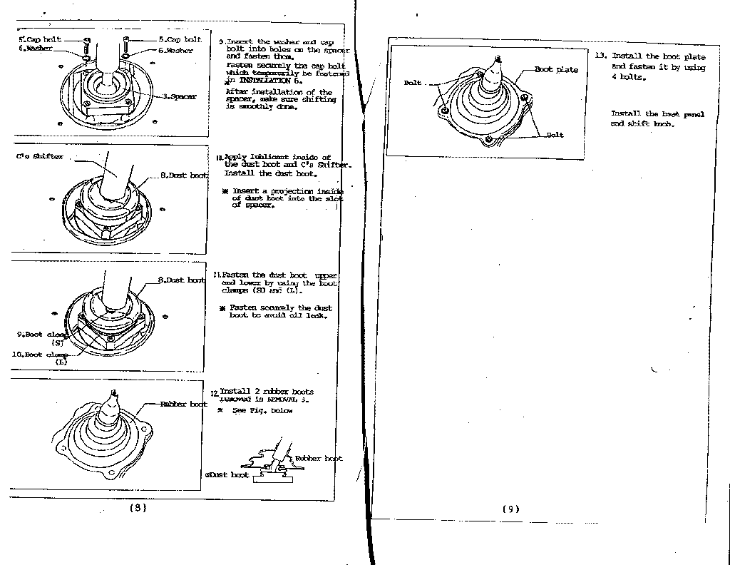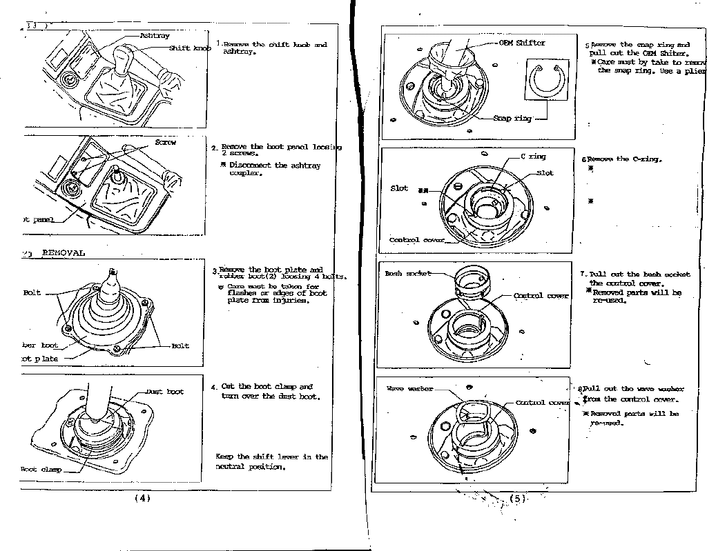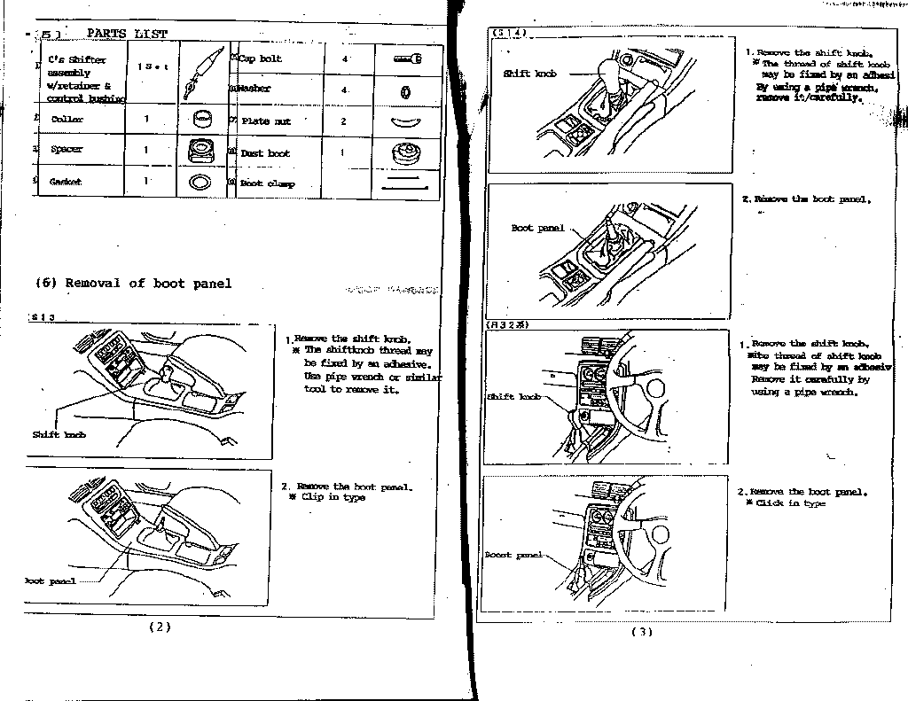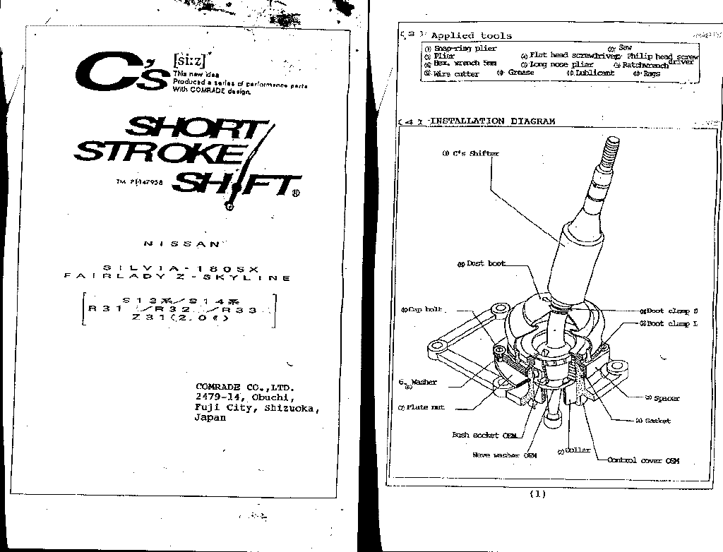 | November 18, 2006 | C's Short Shifter I bought this used in like new conditions from jdm_jdm_parts on ebay. Price was about the same as another stateside that had them brand-new, but they had let me down on two other JDM purchases that took 2+ months before I purchased them elsewhere. I did a buy-it-now late Friday night, before the next weekend they arrived from Hong Kong. That's fast! I love the shorter shifts and no noise. I don't know how the B&M can be shorter or how the 'clicks' matter as mine 'clicks' into gears. I avoided the B&M for the more intensive install. You can avoid the B&M rattle with some dremel magic on the base plate. Installation was simple. Download these pages: Page 1 Page 2 Page 3 Page 4 Page 5 You can also download more info on the Pilot C's shifter clone here [The picture they are using is not what the shifter looks like]. Basic summary on my S14: Tools/Supplies: 10mm socket and ratchet with a 6" extension or a large phillips screwdriver for the dust cover bolts. A couple small flat screwdrivers or picks to remove the snap ring. Snap ring pliers or needlenose pliers for the C-ring (I used small needlenose pliers, Craftsman 8" to be exact). Small diagonal cutters for the zip-ties. 1 zip-tie for the top of the lower boot, small...medium sized zip tie. 1 zip-tie for the bottom of the lower boot, 11" maybe 10" at least...could have been a little thinner to fit in the groove on the C's shifter spacer. Regular pliers to remove the snap ring. White lithium grease for bush socket. 6mm allen key for the C's cap bolts. Some degreaser like Simple Green and shop rags. First if you want to change your transmission fluid now is the best time. Remove the drain and let it come out (car should be level). Replace drain and when you get to the point where you remove the old shifter assembly, remove the fill plug from below...then pour in fluid from the top (being very careful of your interior, I had mine serviced using a pump). Once the fluid comes out the fill plug...let it sit until no more comes out then replace the fill plug...continue installing the shifter. Remove knob [save]. Remove shifter boot and trim [save]. Remove 4 bolts that hold the outer dust cover [save]. Remove dust cover metal trim [save]. Remove upper rubber boot [save]. Remove lower rubber cover [save, not mentioned in the instructions]. I then cleaned up the top on my transmission as my old lower boot's zip tie came off at the bottom and loosened at the top...some trans fluid can gotten out. This explains the 'oil smell' I had after driving hard sometimes. I used Simple Green on a rag and just wiped it down. Cut zip ties on the lower rubber boot [discard ties and boot]. Remove the C-Ring and snap ring [discard, removing the snap ring is the hardest part of the whole install, I pryed from the shifter notch and the front of the snap ring with two screwdrivers, once it was raised I grabbed the end with a regular pair of pliers and pulled it out]. Remove bush socket (the plastic piece with metal pegs that slide into the shifter body) and wave washer [save]. Put in the round metal collar from the C's kit [make sure nothing is rough in the shaft first, mine was smooth]. Put the wave washer on top of it and then the bush socket (which I put some white lithium grease on the inner parts) and topped with the C's paper gasket around it. You want to make sure the bush socket sort of springs up and down and is not bound. If it is your plate nuts won't line up. I changed the way I followed the instructions next a bit. I mounted the C's plate nuts with one cap bolt [I bought my own 6mm x 1.0 cap bolts from the hardware store...I could not find washers to fit though, I used 16mm in length...12mm may have worked] to each of the C's spacer's sides. I aligned the plate nuts so they were out a bit and tight (if left loose they are hard to manage). I then took a little dish soap and lubed the C's shifter and pulled the C's lower boot down over it until it passed the thick part. I rinsed off the soap and dried the assembly. It seemed better to do it this way. This boot is not so easy to get on and I'd rather not try to clean it off over my open tranny. I then inverted the rest of the C's boot upwards so I could see below it. Now you want to feed the shifter assembly down so when the sides of it fit into the bush socket the lower arm curves back and the shifter is not sticking toward your dash (I had the trans in neutral). Slide the C's plate nuts in until the loose ends line up with the bolt holes, make sure you can't lift the shifter assembly up at this stage, if you can then the shifter is not seated fully. Pop in the other two C's cap bolts and tighten them down. Not sure on the torque specs on this... but I tightened them with just an allen key and hand strength, then a little pull with the key and pliers. Make sure the shifting is smooth. Now flip the inverted lower boot back down and over the C's spacer. The C's spacer has a groove in it for the zip-tie. Mine was a little too big to seat into it, but I don't think it will be an issue it's pretty tight. I used a standard 11" american zip tie...Gardner Bender's...I will update with the width. Once that is done, put the lower rubber cover back over the lower boot (there are arrows to align it front to back), the lower boot needs to be pulled up and through this. Next just place the upper rubber boot over it all, then the metal dust cover trim...use a tool to align the holes to the bolt holes and replace the first four bolts you had to remove. Then place back the shifter boot and trim and screw your shifter knob back on. I turned my shift boot inside out at this step and placed a zip-tie at it's top once it's tight against the shift knob so it doesn't flap around. Pop the lower trim back in place and drive. |